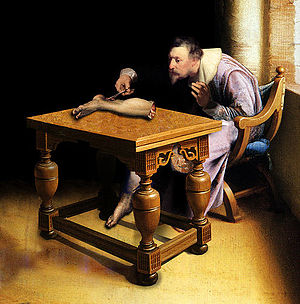 Then I continued reading the Wikipedia page and noticed that the author says that Verheyen studied at the Leids Universitair Medisch Centrum – indeed an existing institution, but a profoundly twentieth-century institution. A bit annoyed with this nonsense now, I scrolled back up and had a closer look at the ‘painting’ of Verheyen dissecting his own leg. Now I immediately saw it was not a painting at all, but a digitally composed image – I actually recognized ‘Verheyen’ as one of the onlookers in Tulp’s Anatomical lesson. When I magnified the image, I noticed the bare ‘stump’ of the leg under the table, and couldn’t help laughing. Someone had put a lot of thought into this!